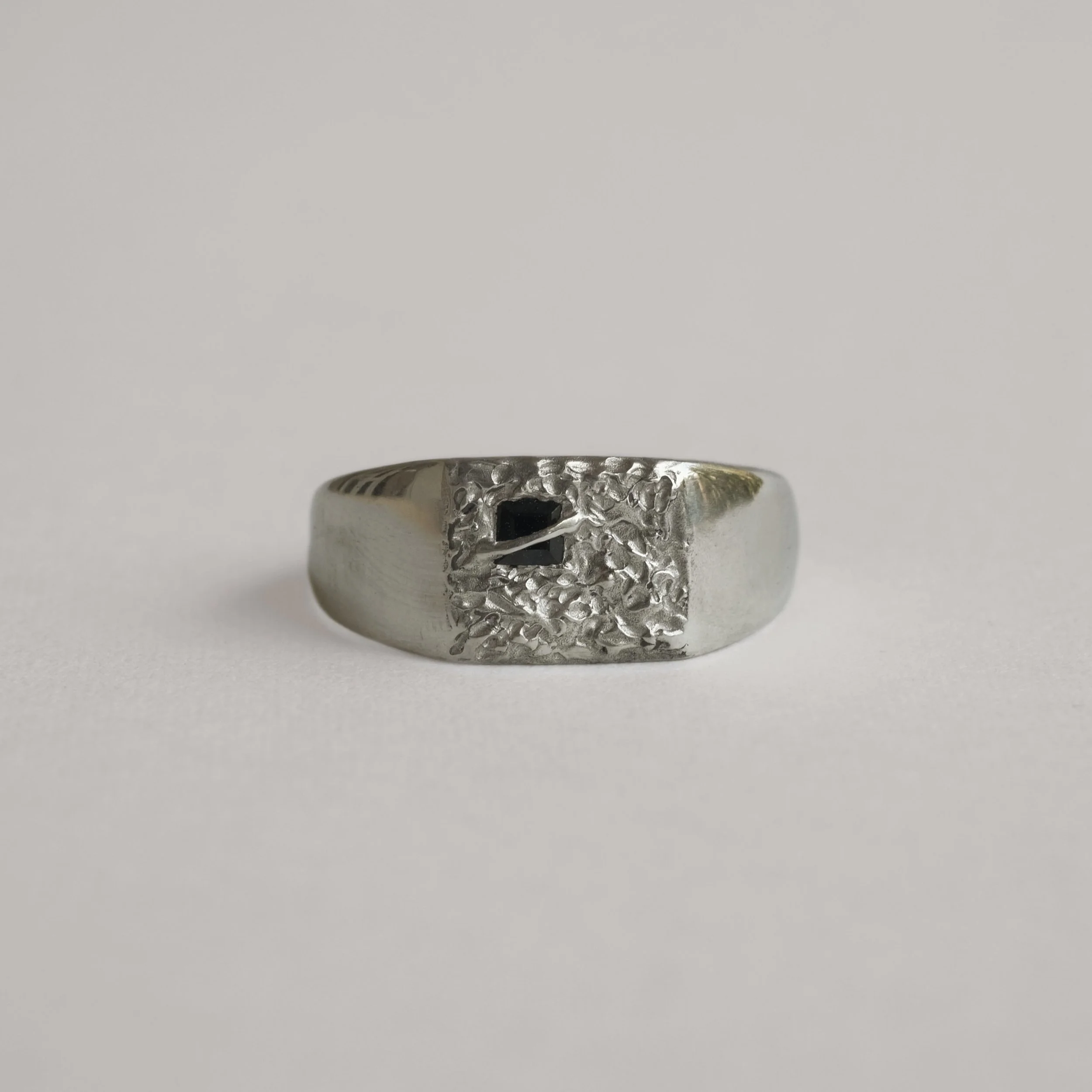 A square-cut black Sri Lankan Sapphire is embedded in a sea of raw, molten sterling silver with a thread of silver across the stone to set it in place.